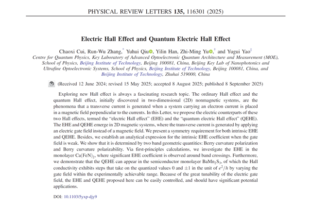 近日,北京理工大学物理学院姚裕贵教授团队基于电场对贝里曲率和能带结构的调控,提出霍尔效应的“电场版本”,即电霍尔效应和量...